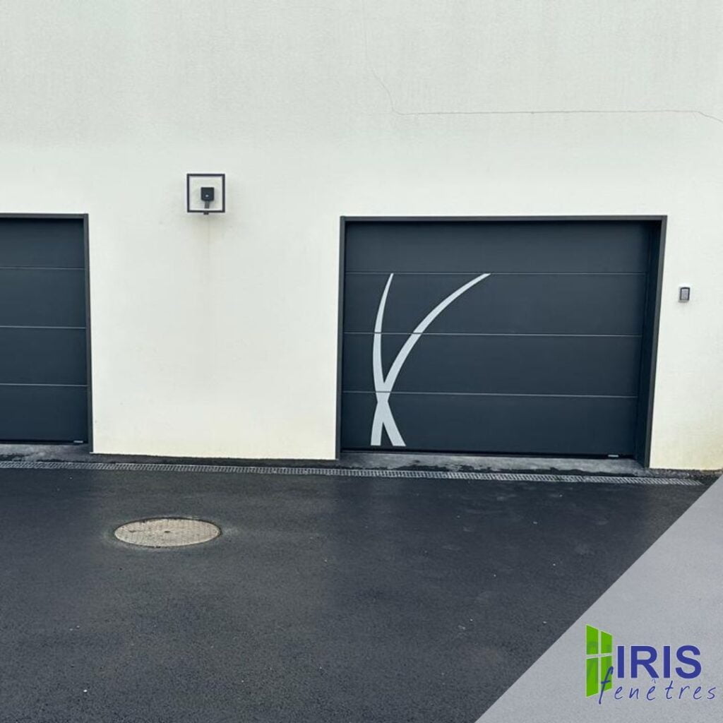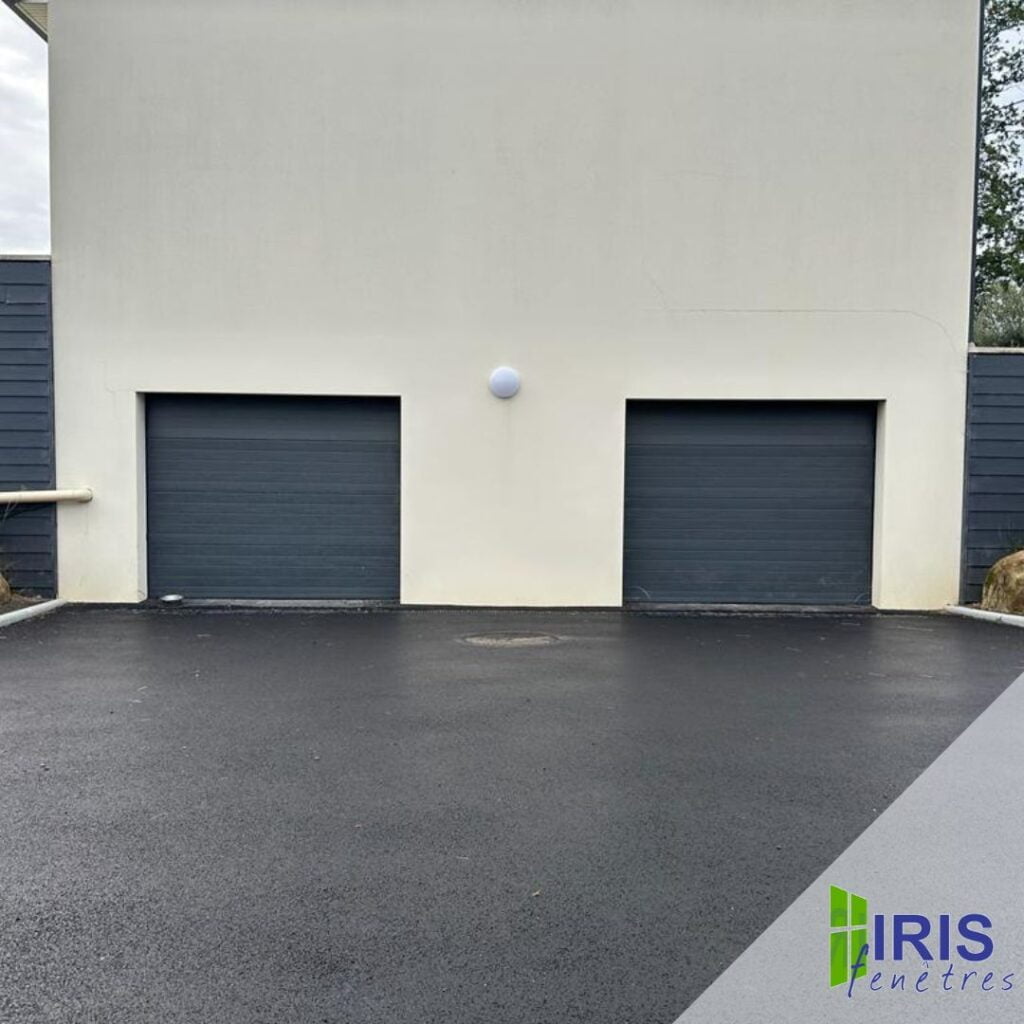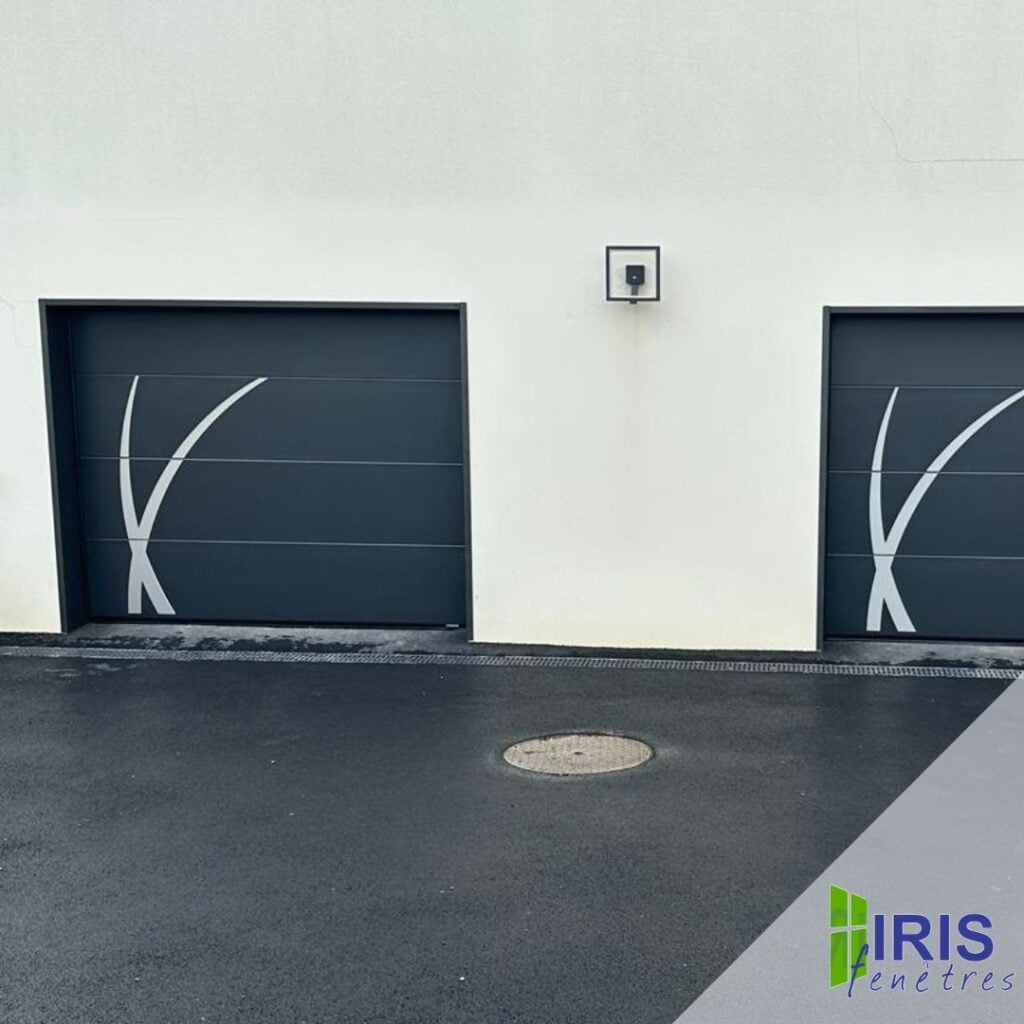 Réalisation d’un AVANT / APRÈS de deux portes de garage sectionnelles par l’agence Yvelines (78) : tablier en acier sans rainure , aspect lisse , portes motorisées , encadrement du tableau en tôle aluminium , avec option motifs aloé blanc pour la touche décorative , coloris noir sablé RAL 2100 de chez La Toulousaine,